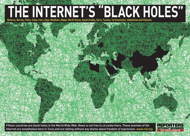 This map was found on Raj Rao's "Aggregated Intelligence" Blog. A software engineer, Rao posts anything that he finds relevant to his work. Although most of his postings usually involve updates on the latest software, innovations in computing hardware, or just fun and interesting tidbits about trending research topics, this particular entry covers the dark and controversial topic of internet censorship. This map is very cluttered with many different lines representing internet communication intersecting each other in a dense network. The black areas on the map show the hard stop of communication by censorship in countries such as Belarus, Burma, China, Cuba, Iran, Libya, Maldives, Nepal, North Korea, Saudi Arabia, Syria, Tunisia, Turkmenistan, Uzbekistan, and Vietnam. The caption of the map describes how news is unable to be circulated in these nations due to harsh government restrictions. This map itself was created by the "Reporters without Borders" Organization, a group dedicated to the freedom of the press. One wonders why, even in modern times such as ours, does censorship even exist. The white backing is almost entirely covered up by the proliferous lines of communication, yet these countries by whatever reason choose not to allow people access. It is truly mind boggling.